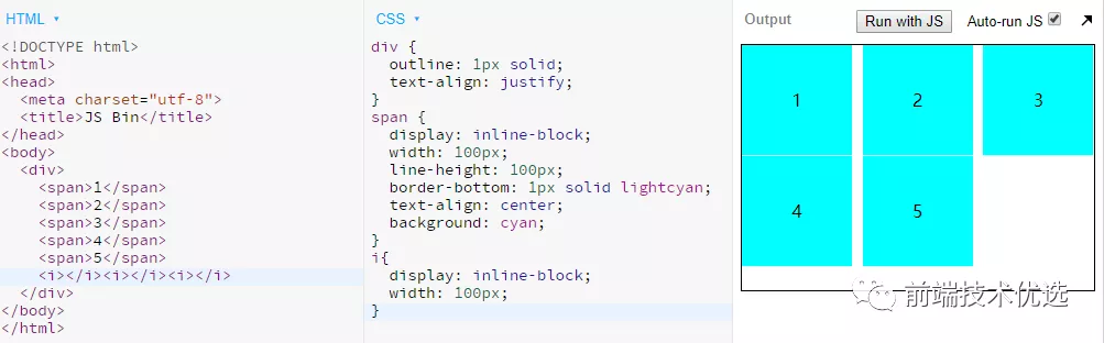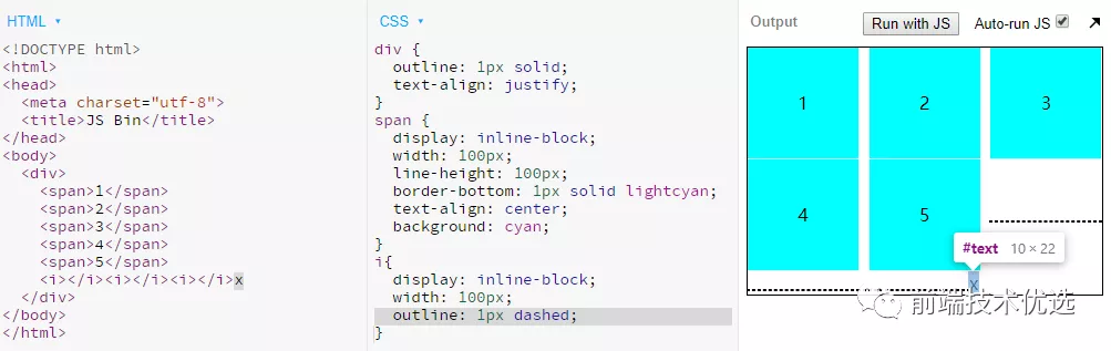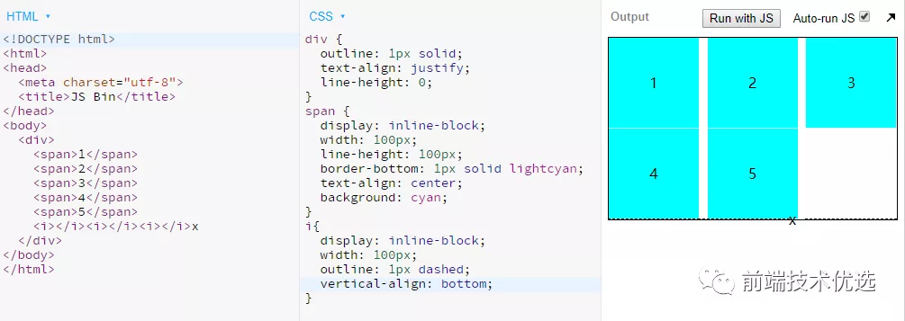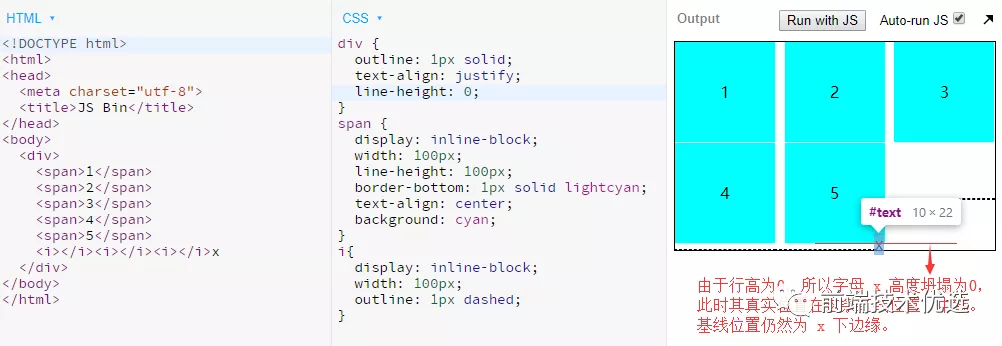 由于text-align: justify最后一行是左对齐,所以利用了三个空的i标签模拟最后一行。虽然实现了两端对齐,但是最后一行却出现间隙。根据之前的经验应该是vertical-align和line-height搞的鬼,我们给i标签加上outline并用字母 x 模拟幽灵空白节点,现形:地址