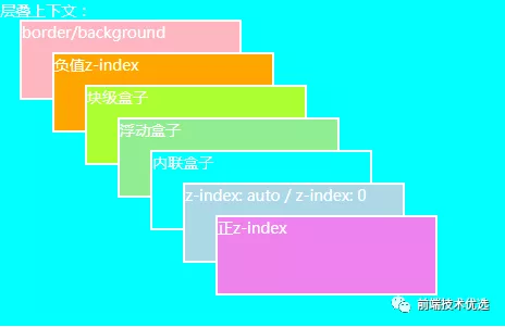 border/background是指当前层叠上下文元素的边框和背景色。z-index为负值的元素在其之上。