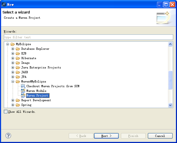 对于Maven,打开MyEclipse,依次进入file-->new—>others—>MyEclipse—>Maven4MyEclipse—>Maven project