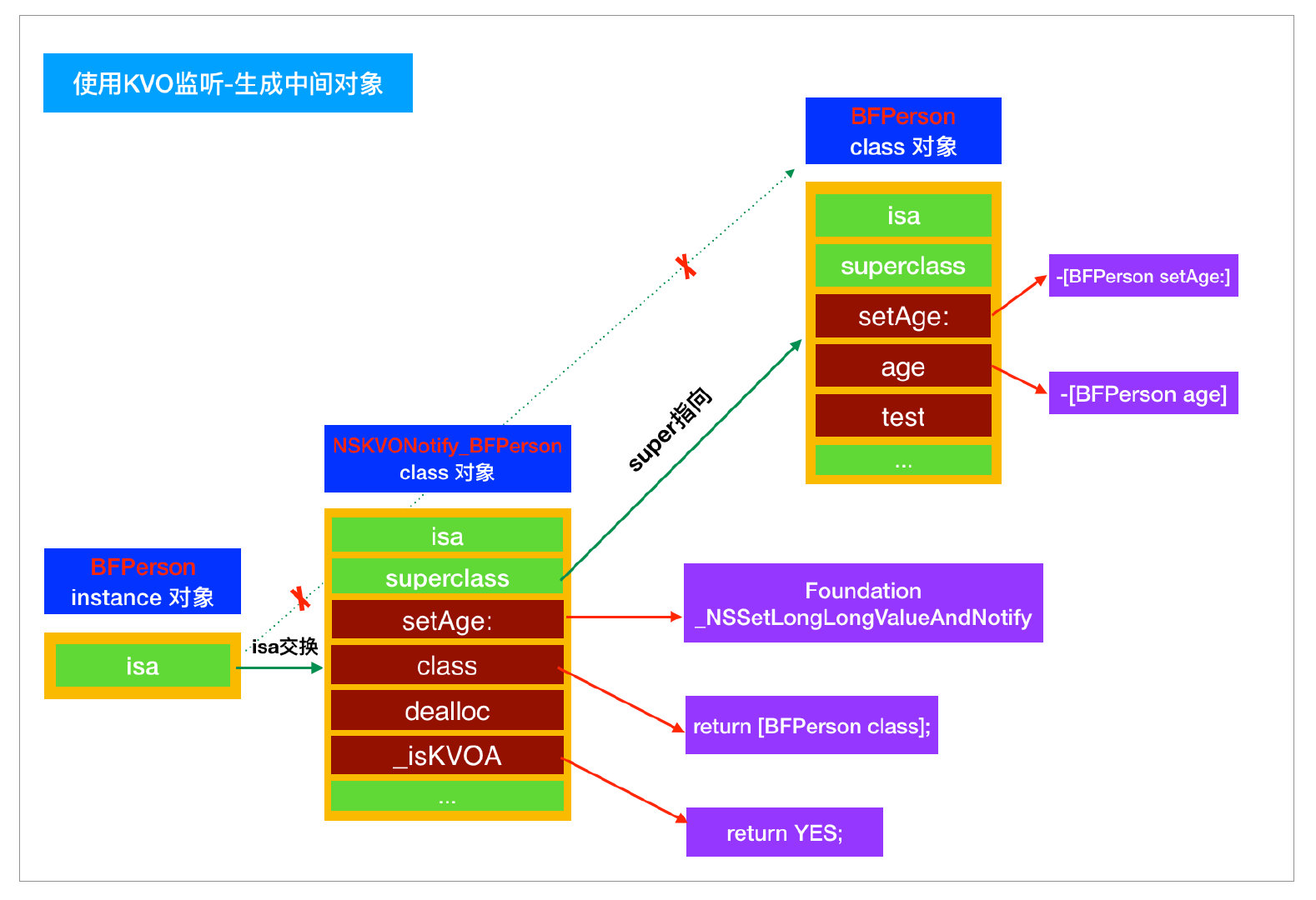 person指向的类对象和元类对象,以及setAge:均发生了变化;- 添加KVO后,