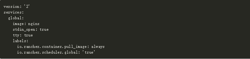 下面的示例是Rancher 1.6中的全局服务示例。请注意,只需放置所需标签就足以使服务全局化。