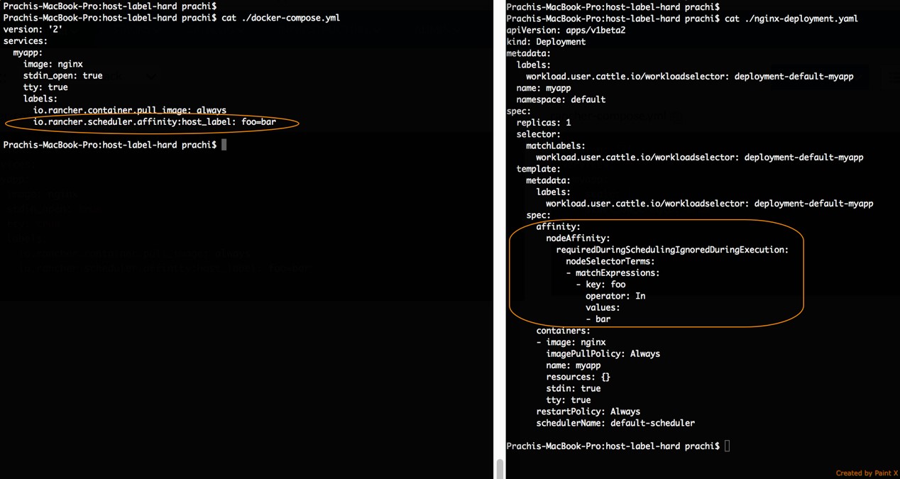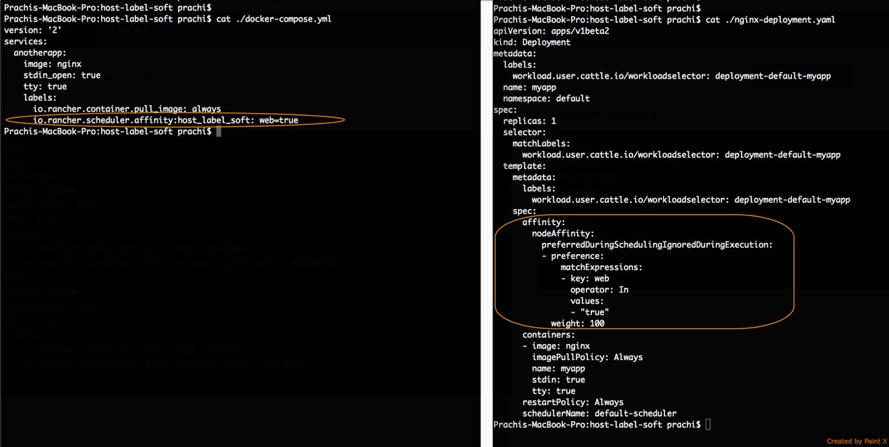 在PodSpec YAML中,此规则将转换为字段nodeAffinity。另外请注意,我已经包含了Rancher 1.6 docker-compose.yml以使用标签实现相同的调度行为。