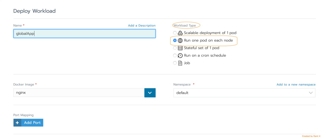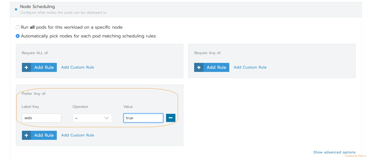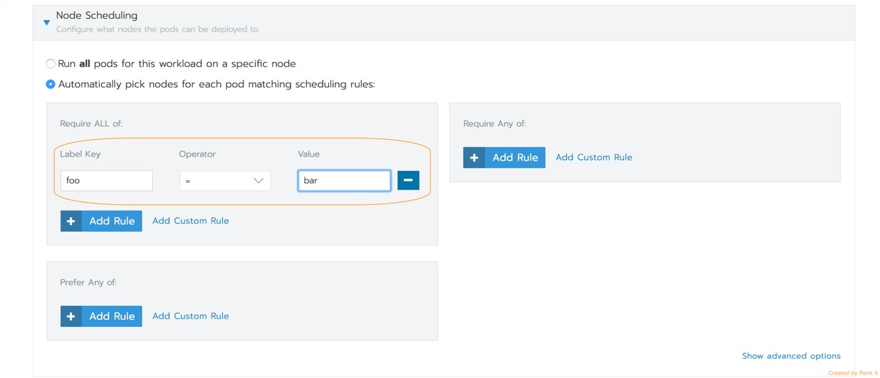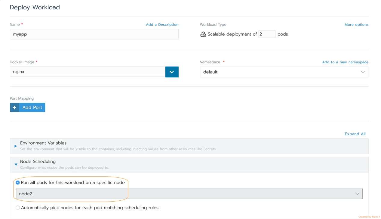 在部署工作负载(导航到Cluster> Project> Workloads)时,可以将工作负载中的所有pod调度到特定节点。