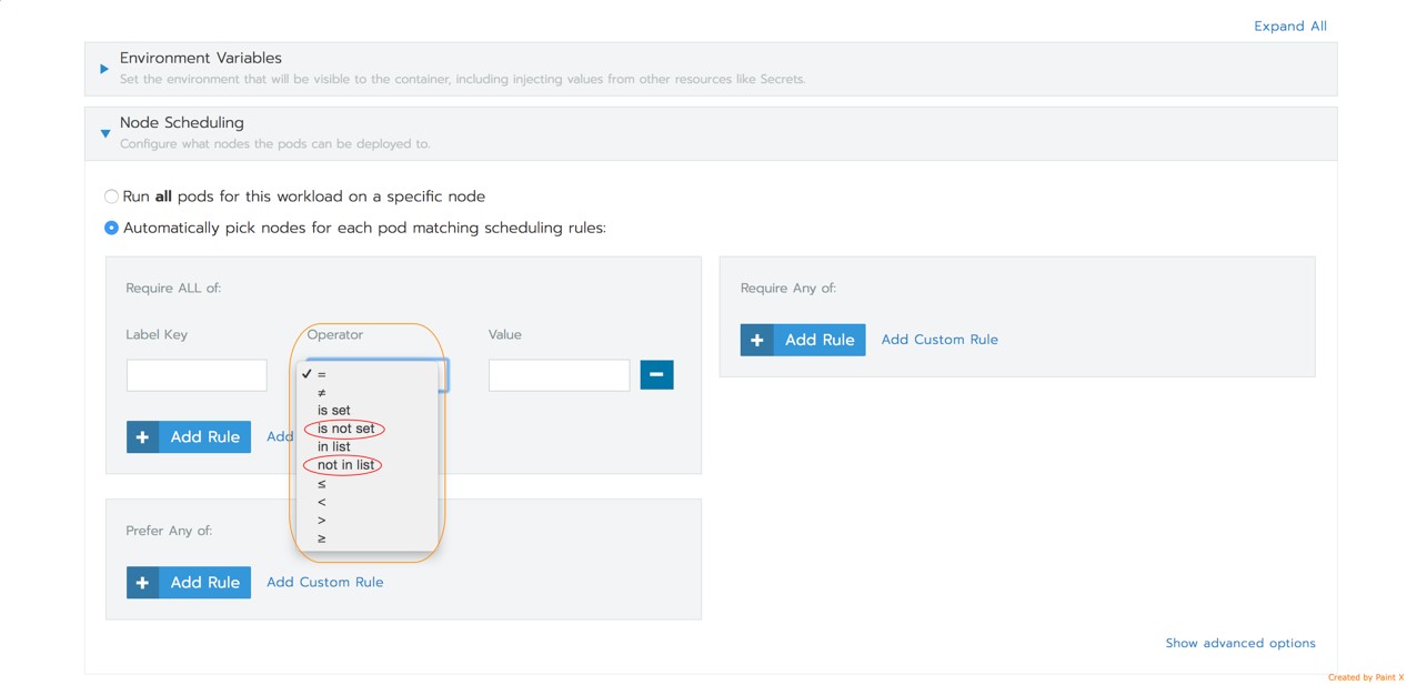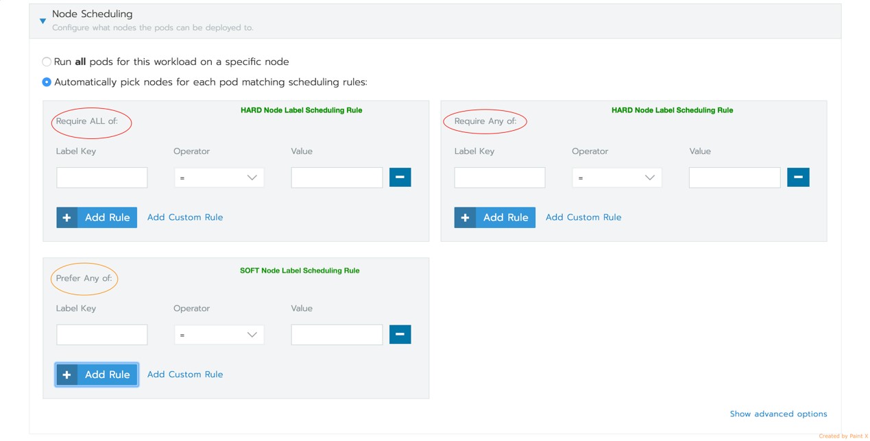 以下是Rancher 2.0中对应的节点调度UI,它在部署工作负载时提供相同的功能。