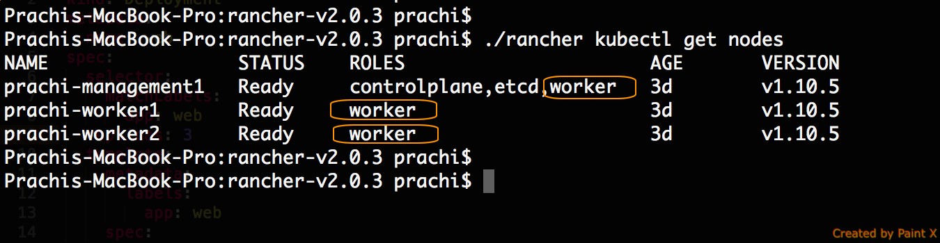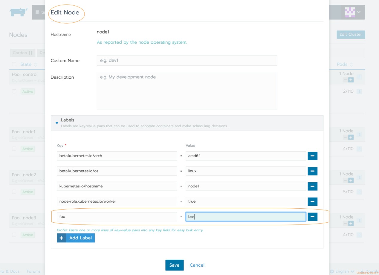 我在Rancher 2.0集群中向node1添加了标签foo = bar,以测试基于标签的节点调度规则。