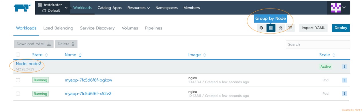 在“工作负载/Workload”选项卡上,您可以按节点列出工作负载。在此,我可以看到我的Nginx工作负载的两个pod都安排在指定的节点上了: