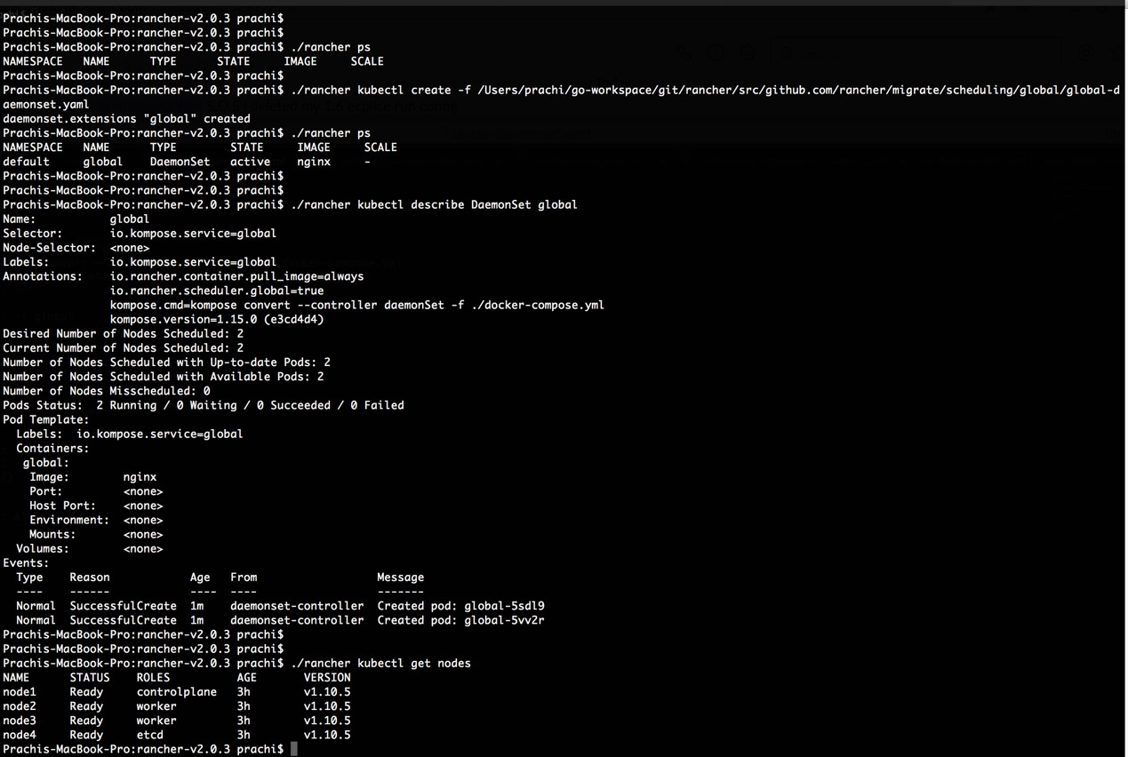 为此,Rancher为用户的工作负载部署了Kubernetes DaemonSet对象(https://kubernetes.io/docs/concepts/workloads/controllers/daemonset/)。DaemonSet的功能与Rancher 1.6全局服务完全相同。Kubernetes调度程序将在集群的每个节点上部署一个pod,并且随着新节点的添加,调度程序将在它们上启动新的pod,前提是它们与工作负载的调度要求相匹配。