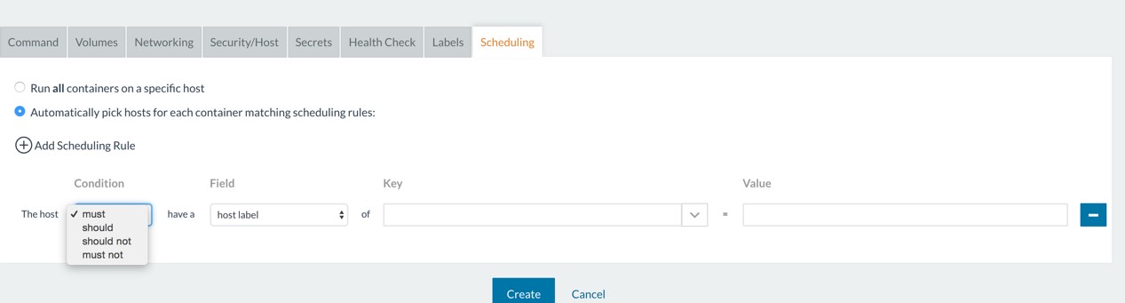 以下是1.6 UI中的调度方式。Rancher允许您在特定主机上运行所有容器,指定硬/软主机标签,或在部署服务时使用亲和性/反亲和性规则。