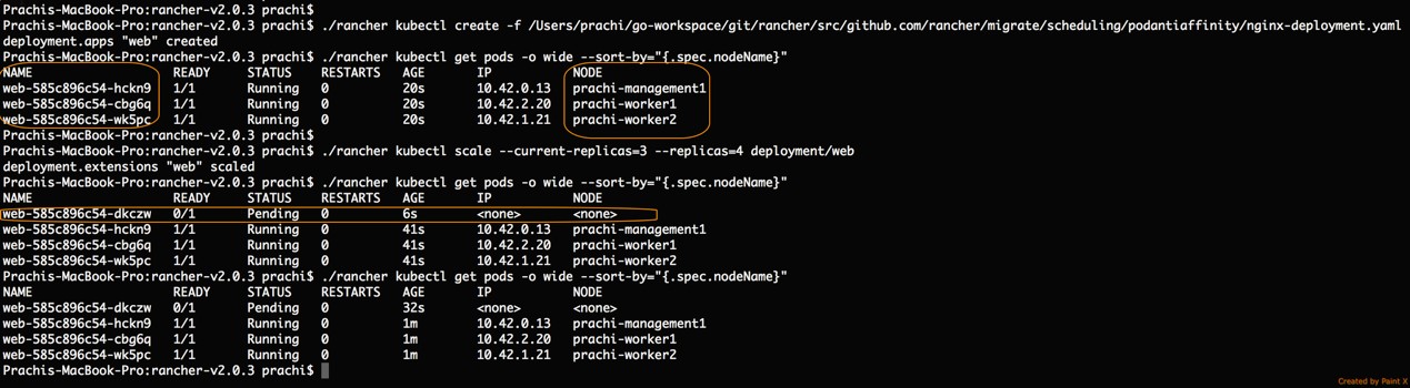 使用Rancher CLI,可以将此工作负载部署到Kubernetes集群上。请注意,上面的部署指定了三个副本,并且我在Kubernetes集群中有三个可调度节点。