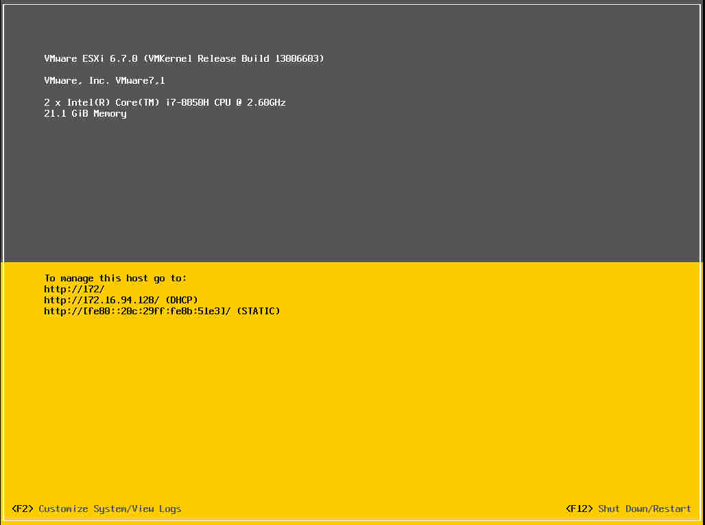 即你面前就是ESXi主机,你可以看到它的显示器,够得着它的键盘和鼠标,并可以使用这三个工具控制、管理这台ESXi主机。一般情况下,看到的界面是: