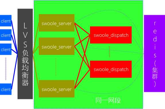 5.可以启动多台swoole server和多台swoole dispatch搭建分布式系统(至少1台LVS,2台swoole server,1台swoole dispatch,1个redis)