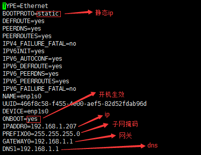 TYPE=Ethernet BOOTPROTO=static DEFROUTE=yes PEERDNS=yes PEERROUTES=yes IPV4_FAILURE_FATAL=no IPV6INIT=yes IPV6_AUTOCONF=yes IPV6_DEFROUTE=yes IPV6_PEERDNS=yes IPV6_PEERROUTES=yes IPV6_FAILURE_FATAL=no NAME=enp1s0 UUID=466f8c58-f455-4e00-aef5-82d52fdab96d DEVICE=enp1s0 ONBOOT=yes IPADDR0=192.168.1.207 PREFIXO0=255.255.255.0 GATEWAY0=192.168.1.1 DNS1=192.168.1.1注:这里的ip、子网掩码、网关按前面window下的匹配配置