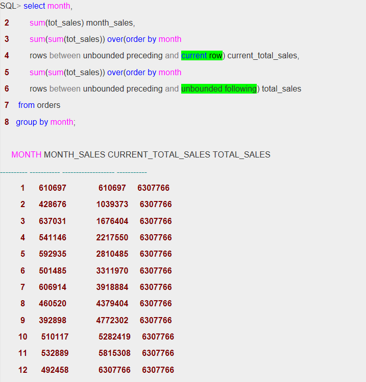 sum(sum(tot_sales)) over(order by month rows between unbounded preceding and current row) current_total_sales。但是大家想下这种方法和第一种方法区别。这种方法会从头到尾计算累加,不区分年,不管有多少年的数据,都是从第一行累加到最后一行;第一种方法会区分年,即在每个年份内,按月累加。