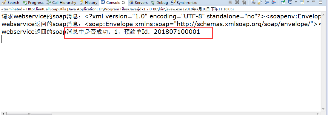 System.out.println("webservice返回的soap消息中是否成功:"+success+",预约单Id:"+clubAptId);