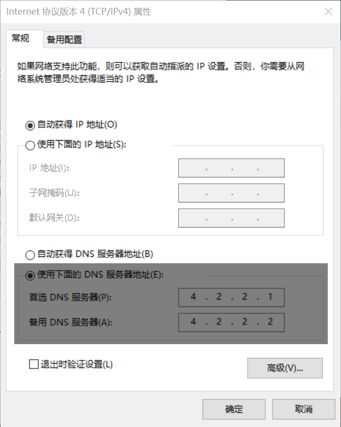 ▶ 将 DNS 服务器手动设置为“4.2.2.1” 和 “4.2.2.2”,确定后重试。