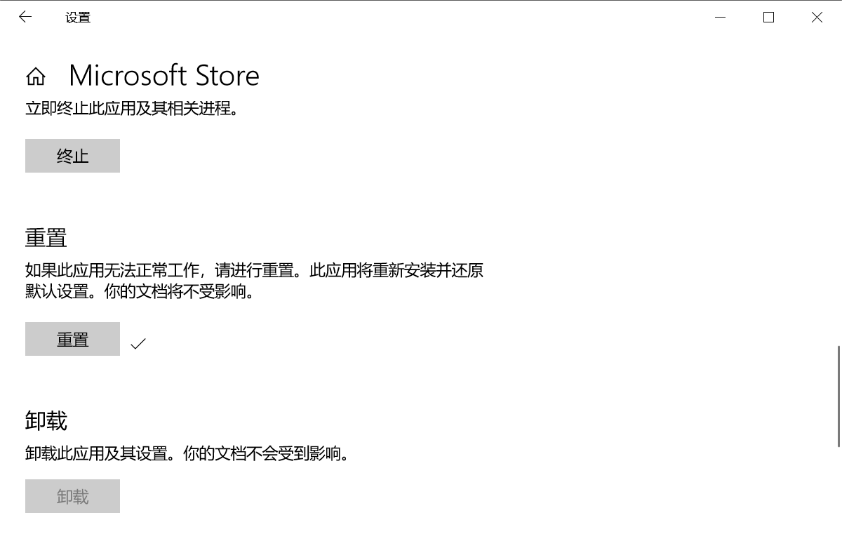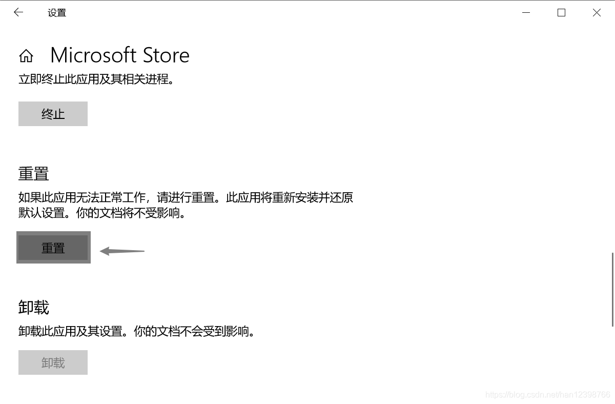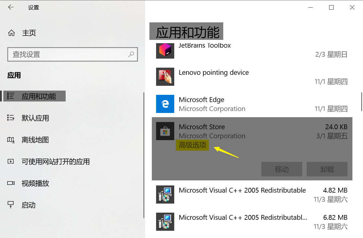 ▶ 打开 设置>应用>应用和功能>在左边的列表中找到应用商店选中>高级选项>重置。