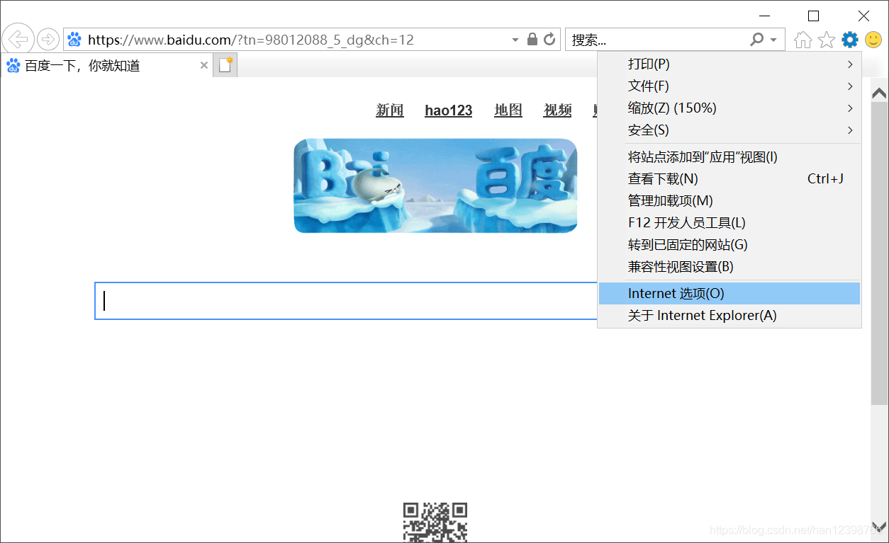 ▶ 打开 IE 浏览器,点击设置,打开 Internet 选项,点击高级