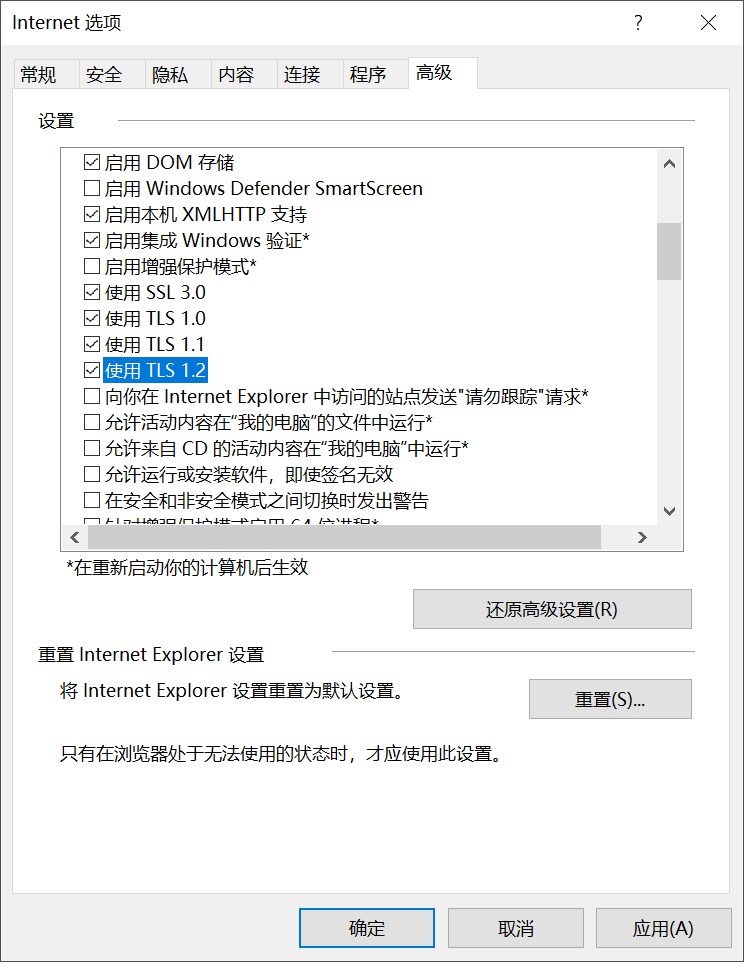 ▶ 勾选 “使用SSL 3.0”、”使用 TLS 1.0“、”使用 TLS 1.1“、”使用 TLS 1.2“,应用后重启电脑,查看能否解决问题。