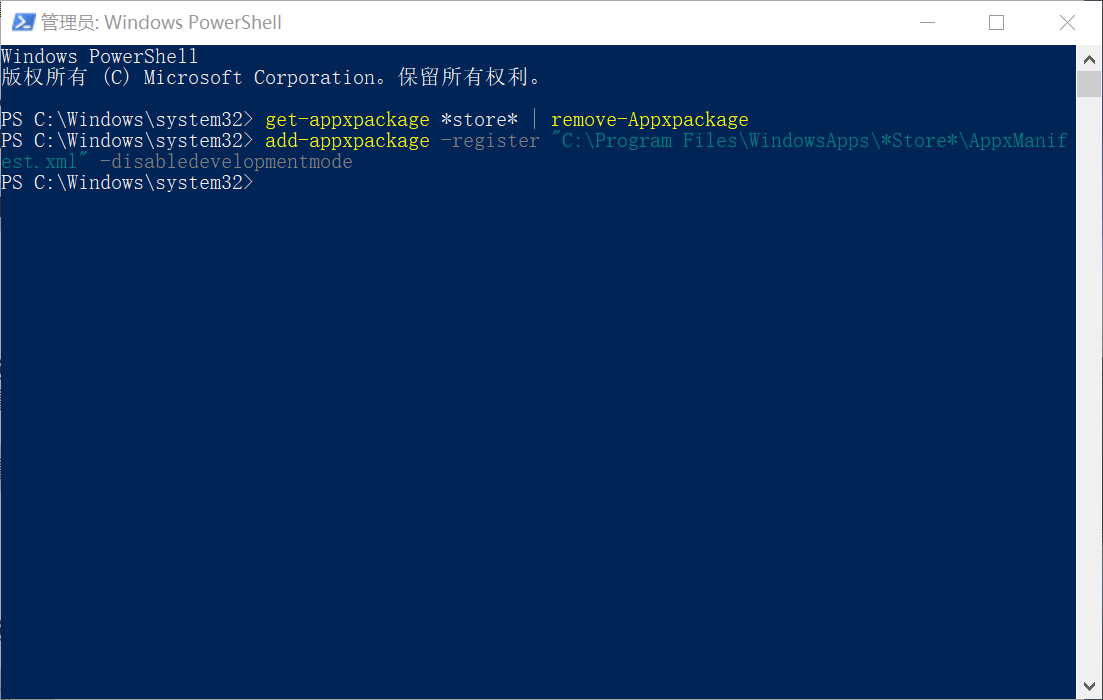 # add-appxpackage -register "C:\Program Files\WindowsApps\*Store*\AppxManifest.xml" -disabledevelopmentmode