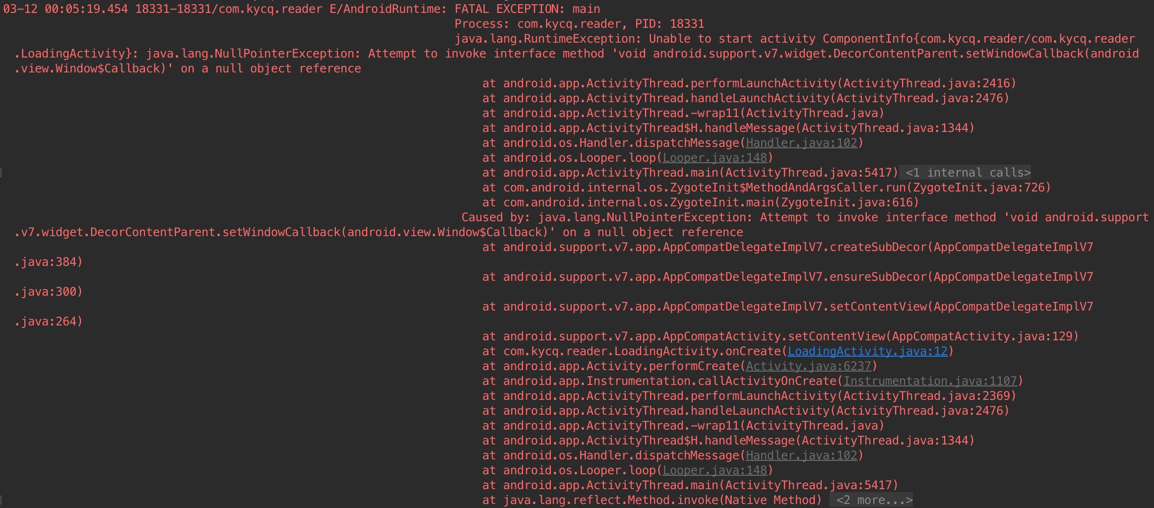 java.lang.RuntimeException: Unable to start activity ComponentInfo{com.kycq.reader/com.kycq.reader.LoadingActivity}: java.lang.IllegalStateException: You need to use a Theme.AppCompat theme (or descendant) with this activity.