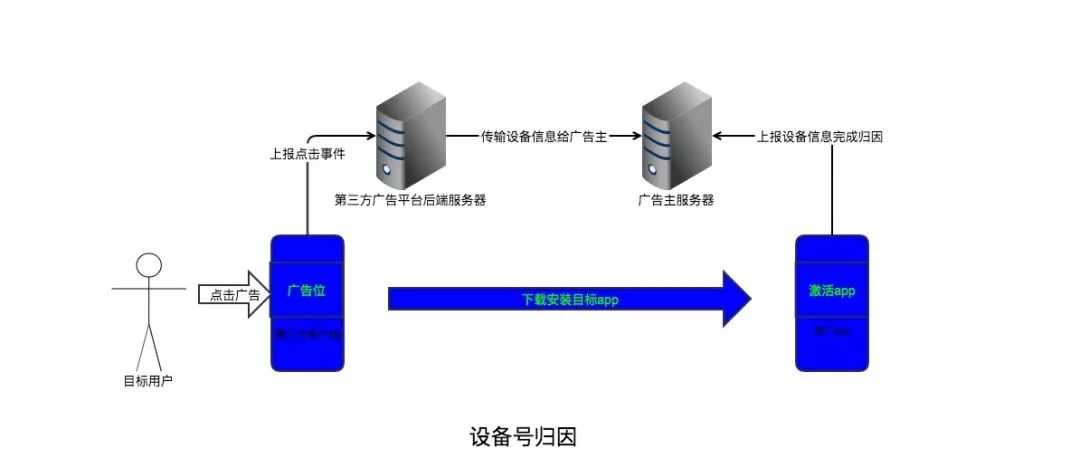 大多数情况下,第三方 App 都可以获取到用户移动终端的设备号,如 iOS 系统下设备的 IDFA、Android 设备的 IMEI。因此在信息流等广告中,第三方平台反馈给广告主的点击数据通常会包含用户的设备号信息。当用户下载 App 完成激活后,可以将获取到的设备号与第三方广告平台反馈的设备号进行匹配进行归因,来评估投放效果。