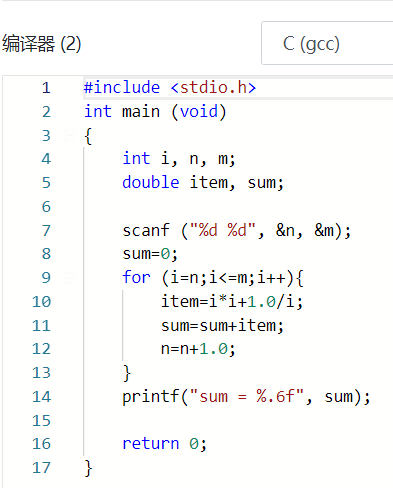 数据处理:表达式:for (i=n;i<=m;i++){ item=i*i+1.0/i; sum=sum+item; n=n+1.0;