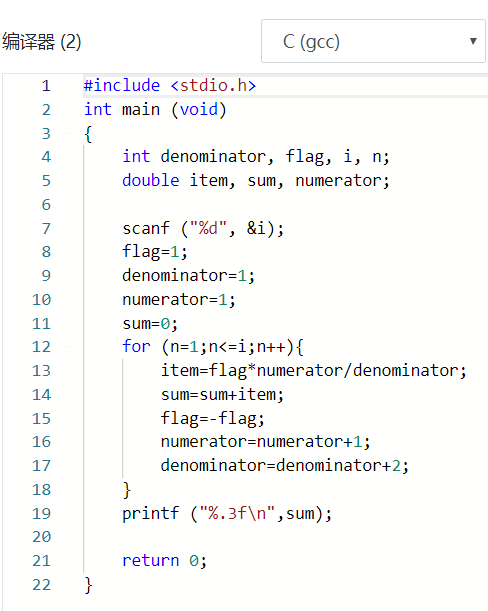 数据表达:运用了整形变量denominator, flag, i, n,双精度浮点变量item, sum, numerator和for循环语句。
