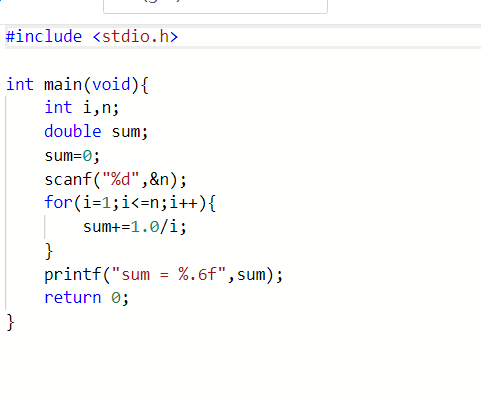 数据表达:本题用了整形变量n,i,浮点型变量sum,其中n,i用来控制for循环的结束,sum用来统计累加起来的和。