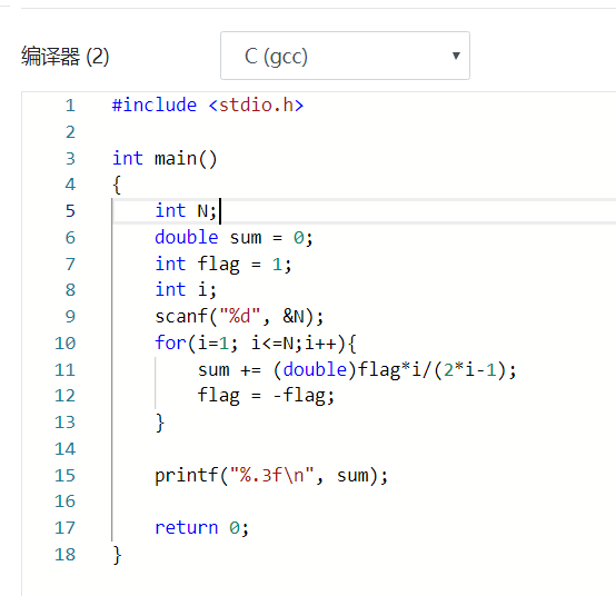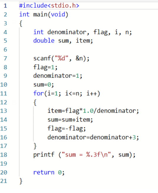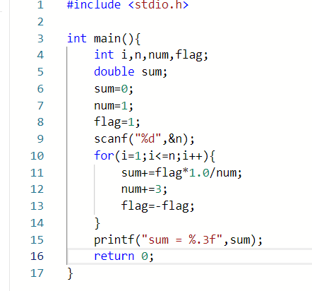 数据表达:使用了i,n,sum,flag四个变量,其中n,i,flag定义为整型,而sum定义为双精度浮点型,n用于输入,i用于for语句,flag控制符号,sum用于输出