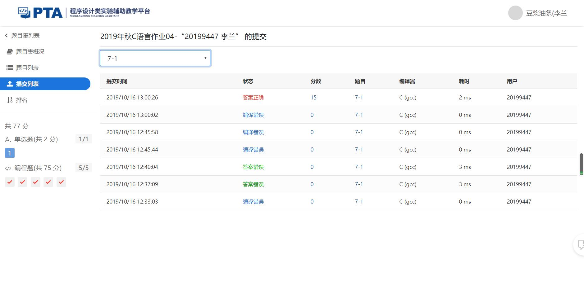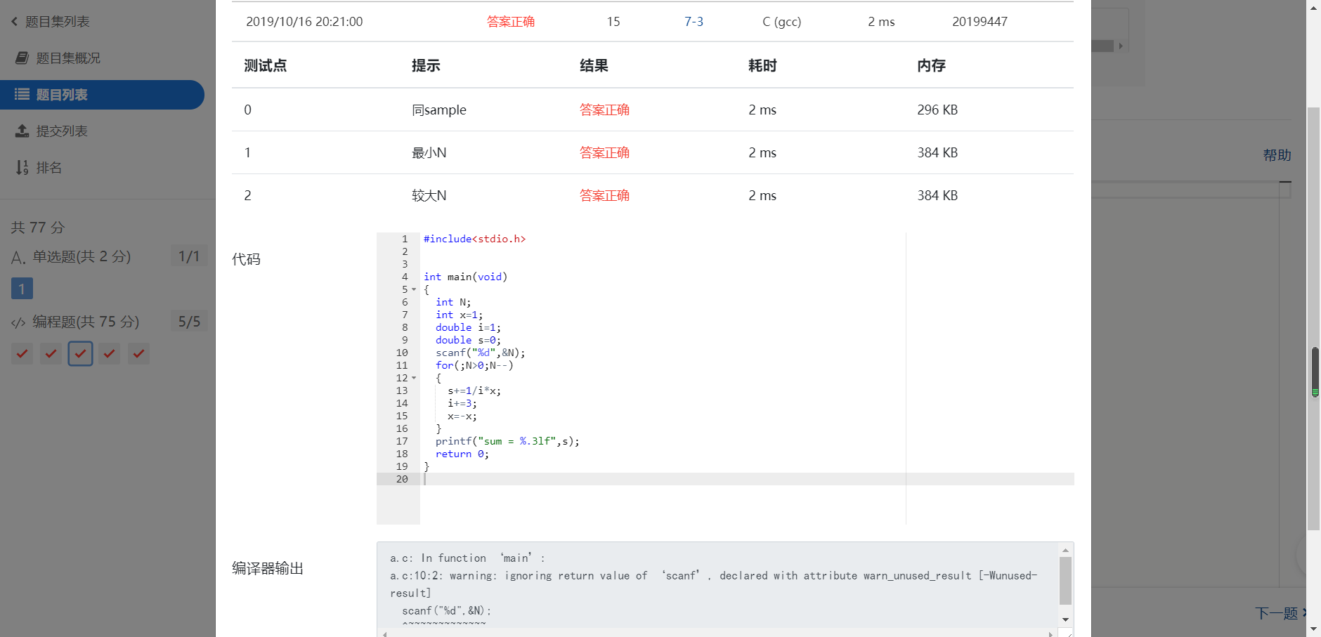 存在的疑惑:关于PTA中的scanf返回值被忽略的疑惑,拿第三题来说,在PTA中就会有这个返回值被忽略的警告,无论是答案错误还是答案正确。所以这次的答案我是对照别人的格式来打的。我经常会遇上这种情况,然后我想问下老师