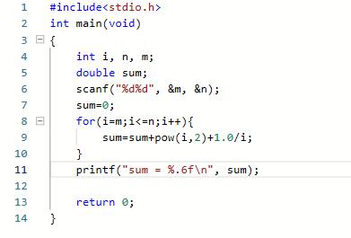 问题描述:本题要求对两个正整数m和n(m≤n)编写程序,计算序列和m2+1/m+(m+1)2+1/(m+1)+⋯+n2+1/n。