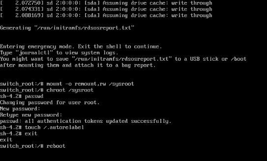 第4步:依次输入以下命令,等待系统重启操作完毕,然后就可以使用新密码来登录Linux系统了。