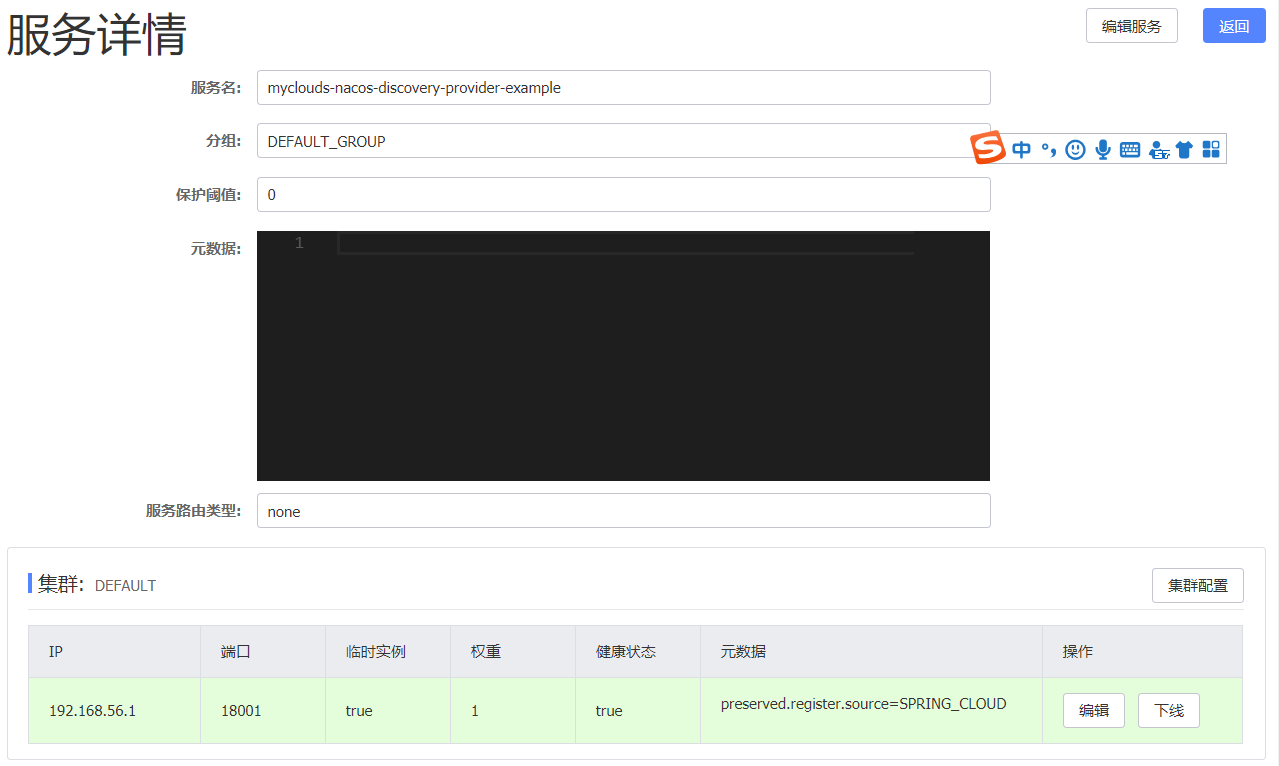 进入nacos控制台,服务管理->服务列表 菜单即可看到本实例的银行卡查询业务的提供者服务和消费者服务的相关信息。如下图所示。