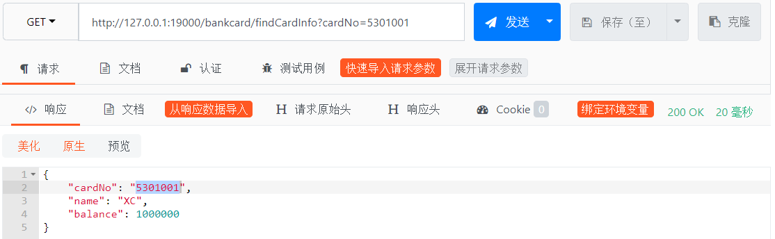 通过服务消费者访问服务:http://127.0.0.1:19000/bankcard/findCardInfo?cardNo=5301