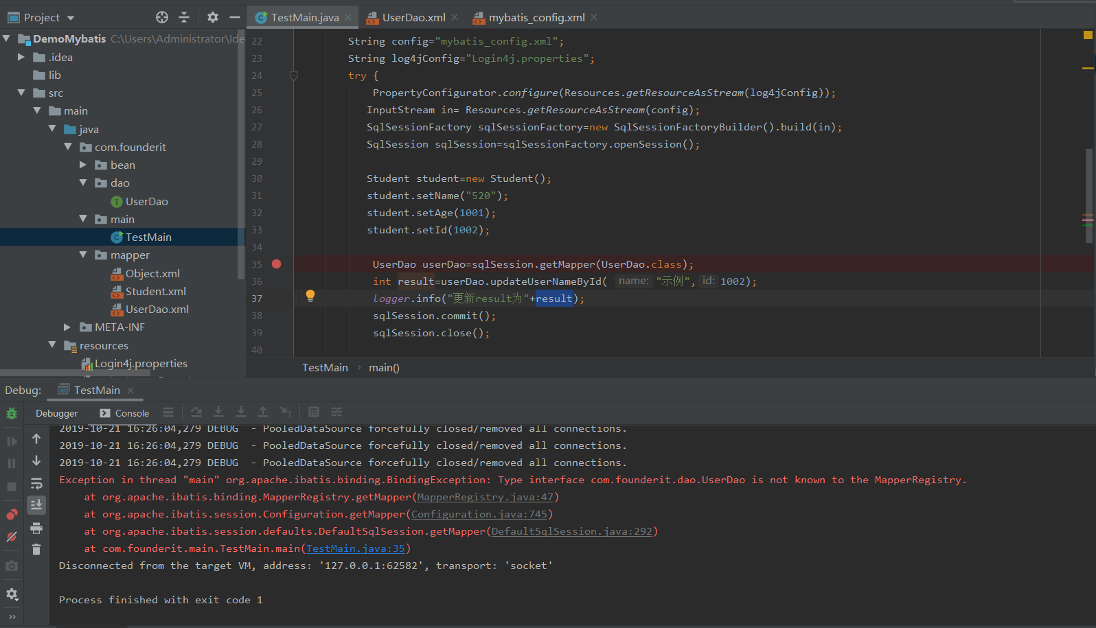 Exception in thread "main" org.apache.ibatis.binding.BindingException: Type interface com.founderit.dao.UserDao is not known to the MapperRegistry.