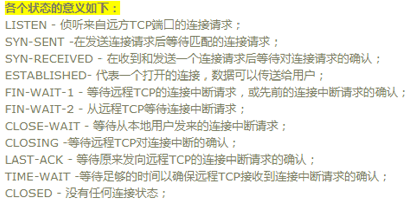 FIN_WAIT_2:上面已经详解了这样的状态,实际上FIN_WAIT_2状态下的SOCKET。表示半连接,也即有一方要求close连接,但另外还告诉对方,我临时还有点数据须要传送给你,稍后再关闭连接。