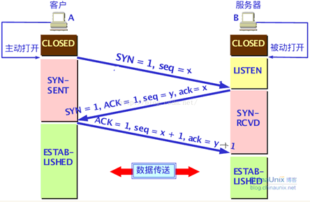 从图中可以看出,当客户端调用connect时,触发了连接请求,向服务器发送了SYN包,这时connect进入阻塞状态;服务器监听到连接请求,即收到了SYN J包,调用accept函数接收请求 向客户端发送SYN K,ACK J+1,这时accept进入阻塞状态;客户端收到服务器的SYN K,ACK J+1之后,这时connect返回,并且对SYN K进行确认;服务器收到ACK K+1,accept返回,至此三次握手完毕,连接建立。客户端的connect在三次握手的第二次返回,而服务器端的accept在三次握手的第三次返回。