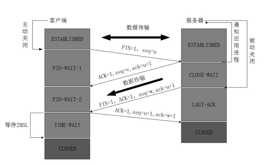 数据传输完毕后,双方都可释放连接。最开始的时候,客户端和服务器都是处于ESTABLISHED状态,然后客户端主动关闭,服务器被动关闭。
