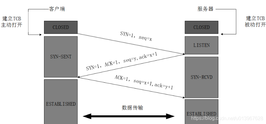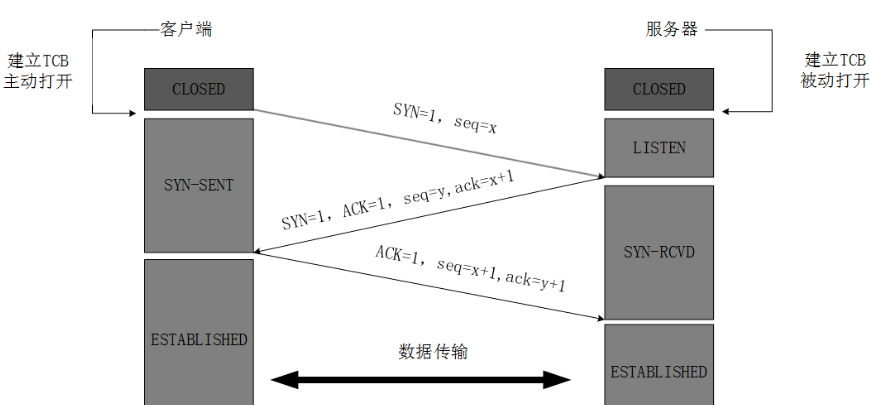 - TCP客户进程收到确认后,还要向服务器给出确认。确认报文的ACK=1,ack=y+1,自己的序列号seq=x+1,此时,TCP连接建立,客户端进入ESTABLISHED(已建立连接)状态。TCP规定,ACK报文段可以携带数据,但是如果不携带数据则不消耗序号。