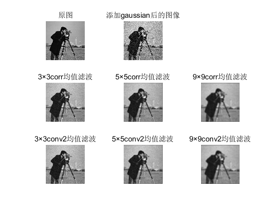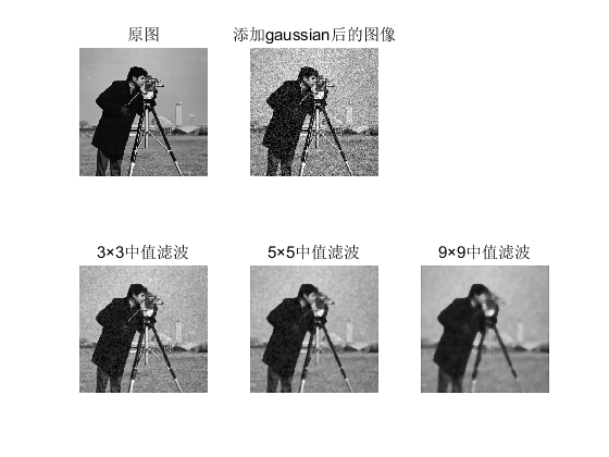 close all; clear all; clc A1 = imread('cameraman.tif'); A = imnoise(A1,'gaussian', 0.05); %均值滤波 b_average1 = fspecial('average'); b_average2 = fspecial('average',[5 5]); b_average3 = fspecial('average', [9 9]); C_average1_corr = imfilter(A,b_average1); C_average2_corr = imfilter(A,b_average2); C_average3_corr = imfilter(A,b_average3); C_average1_conv2 = imfilter(A,b_average1,'conv'); C_average2_conv2 = imfilter(A,b_average2,'conv'); C_average3_conv2 = imfilter(A,b_average3,'conv'); figure; subplot(331);imshow(A1);title('原图') subplot(332);imshow(A);title('添加gaussian后的图像') subplot(334);imshow(C_average1_corr);title('3×3corr均值滤波') subplot(335);imshow(C_average2_corr);title('5×5corr均值滤波') subplot(336);imshow(C_average3_corr);title('9×9corr均值滤波') subplot(337);imshow(C_average1_conv2);title('3×3conv2均值滤波') subplot(338);imshow(C_average2_conv2);title('5×5conv2均值滤波') subplot(339);imshow(C_average3_conv2);title('9×9conv2均值滤波') 中值滤波: