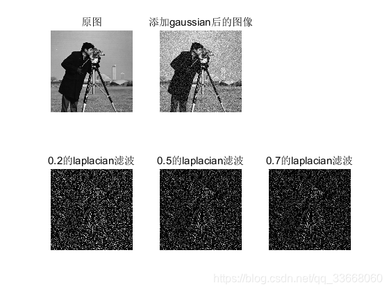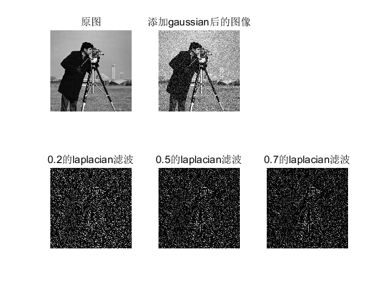 close all; clear all; clc A1 = imread('cameraman.tif'); A = imnoise(A1,'gaussian', 0.05); %中值滤波 C_medfilt1 = medfilt2(A,[3 3]); C_medfilt2 = medfilt2(A,[5 5]); C_medfilt3 = medfilt2(A,[9 9]); figure; subplot(231);imshow(A1);title('原图') subplot(232);imshow(A);title('添加gaussian后的图像') subplot(234);imshow(C_medfilt1);title('3×3中值滤波') subplot(235);imshow(C_medfilt2);title('5×5中值滤波') subplot(236);imshow(C_medfilt3);title('9×9中值滤波') 拉普拉斯算子: