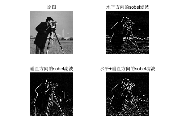 close all; clear all; clc A = imread('cameraman.tif'); %sobel b_sobel = fspecial('sobel'); C_sobel1 = imfilter(A,b_sobel); C_sobel2 = imfilter(A,b_sobel'); C_sobel3 = imfilter(C_sobel1,b_sobel'); figure; subplot(221);imshow(A);title('原图') subplot(222);imshow(C_sobel1);title('水平方向的sobel滤波') subplot(223);imshow(C_sobel2);title('垂直方向的sobel滤波') subplot(224);imshow(C_sobel3);title('水平+垂直方向的sobel滤波') 其余的就不一一实现了,有兴趣的小伙伴,可以自己弄弄。