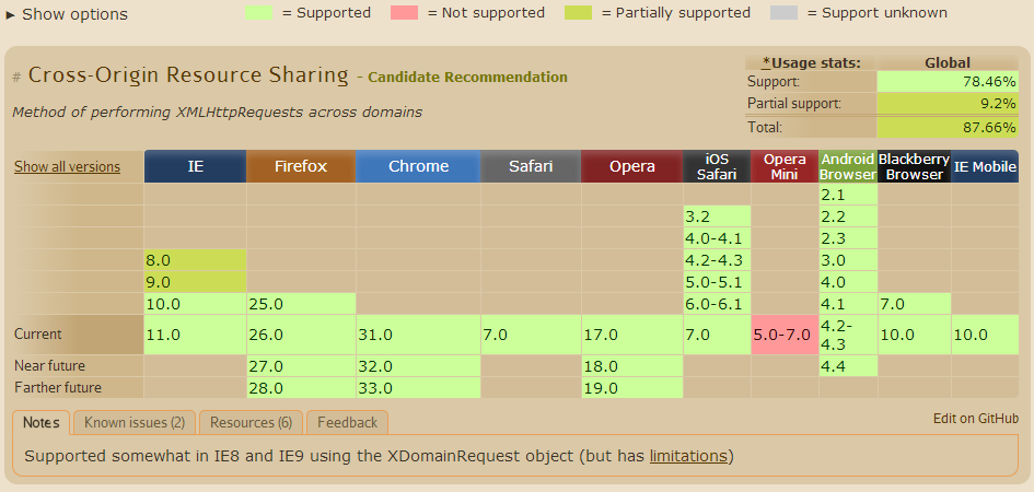 刚刚说到的兼容性。CORS是W3C中一项较新的方案,所以部分浏览器还没有对其进行支持或者完美支持,详情可移至 http://www.w3.org/TR/cors/