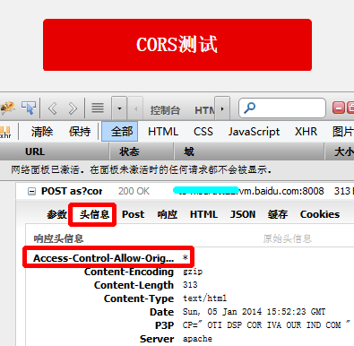 当前我设置的header为“*”,任意一个请求过来之后服务端我们都可以进行处理&响应,那么在调试工具中可以看到其头信息设置,其中见红框中有一项信息是“Access-Control-Allow-Origin:* ”,表示我们已经启用CORS,如下图。