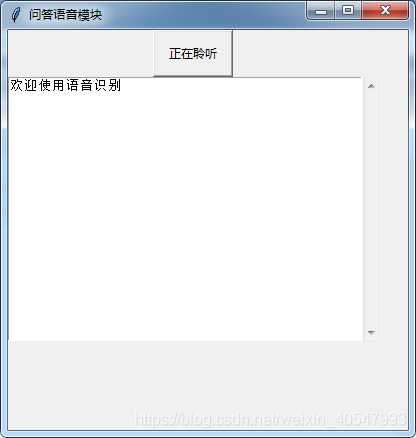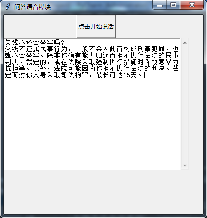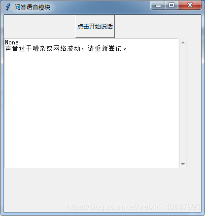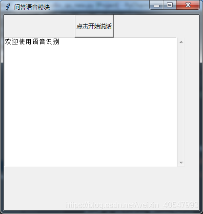 首先通过tkinter函数用来创建窗口,添加文本框和滚动条;创建按钮Button,通过点击 “点击开始说话” 启动整个程序运行