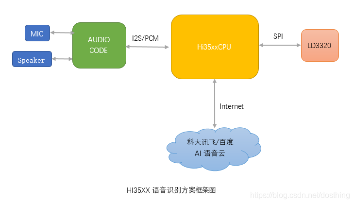 语音识别方案分为硬件本地实现和智能语音云实现,我比较推崇使用云方式,它成本较低,后期维护少,识别准确率高,而且随着5G商业化浪潮实现,网络延时基本可以忽略,语音识别实时性与本地相比无异。配合HIMPP平台的API使用实现音频采集、处理、推云平台的功能并不难,首先MIC作为音频模拟信号输入源,由AUDIO CODE芯片进行模数转换,然后通过I2S或者PCM方式与CPU进行数据交互,接着CPU通过Socket连接云服务器进行推流,云将语音识别的数据返回。此外,云还有语音合成功能,它可以将文字合成为语音,此过程恰好与语音识别的数据流相反,并最终推向speaker。HIMPP平台的API使用可以参考《海思HI35xx平台软件开发快速入门之背景知识》