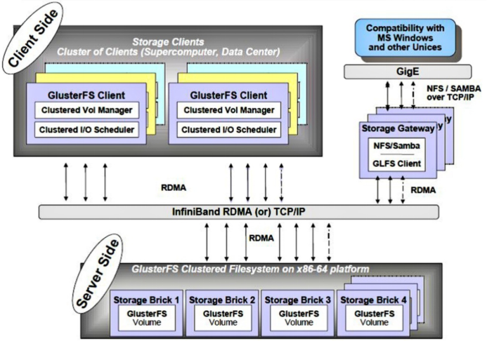 GlusterFS基于可堆叠的用户空间以及无元的设计,可为各种不同的数据负载提供优异的性能。