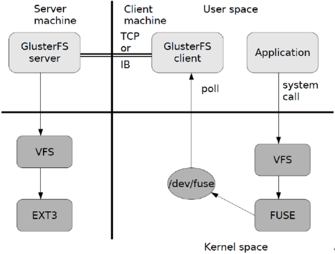 - VFS将数据传递交给FUSE内核文件系统,并向系统注册一个实际的文件系统FUSE,而FUSE文件系统则是将数据通过/dev/Fuse设备文件传递交给了GlusterFS client端。可以将FUSE文件系统理解为一个代理。
