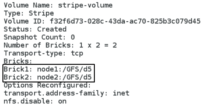 指定类型为stripe,数值为2,而且后面跟了2个Brick Server。所以创建的是条带卷